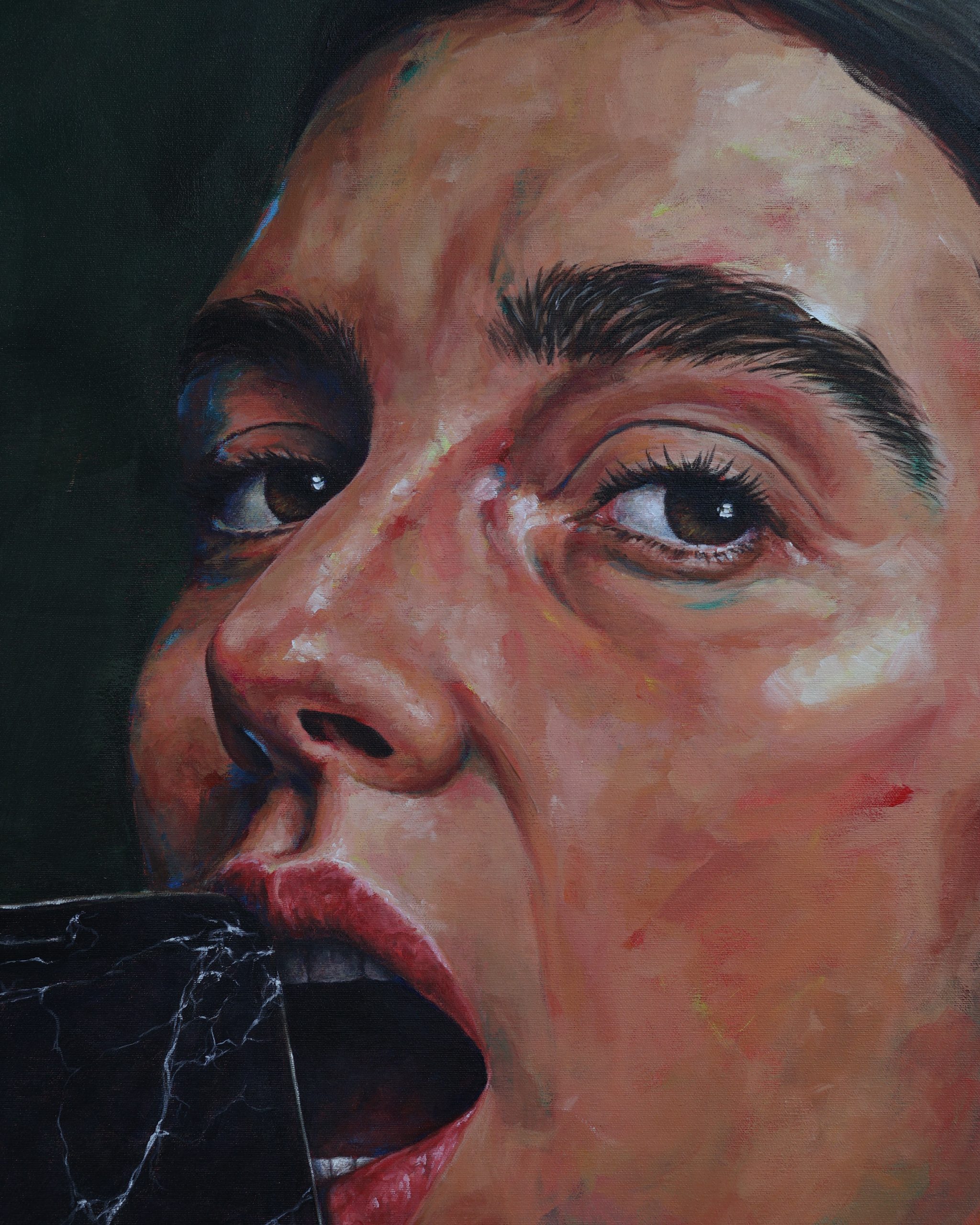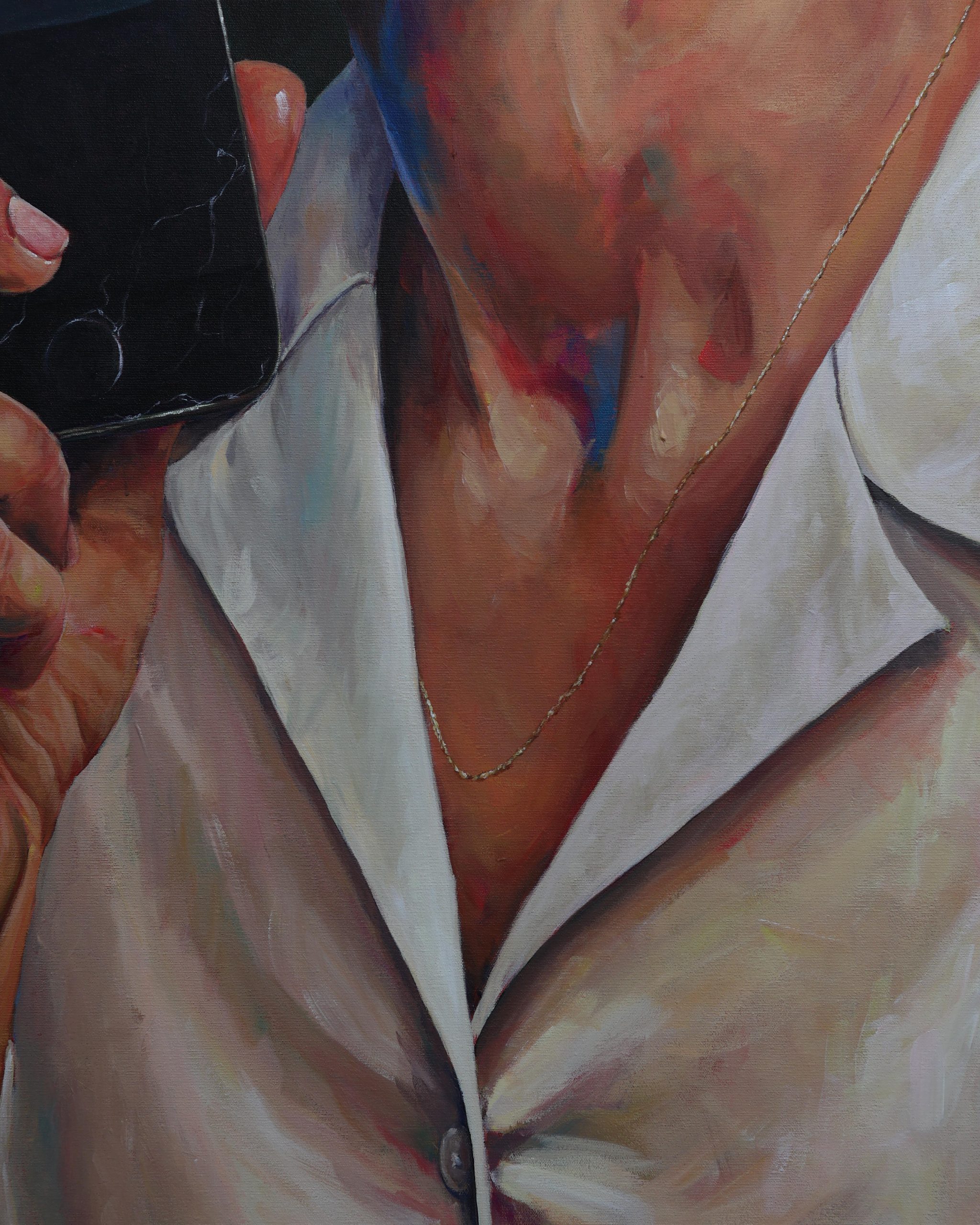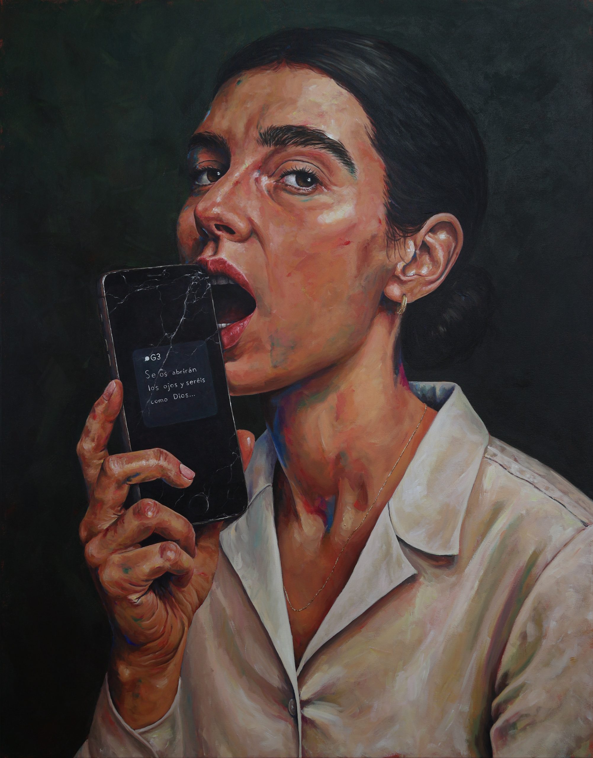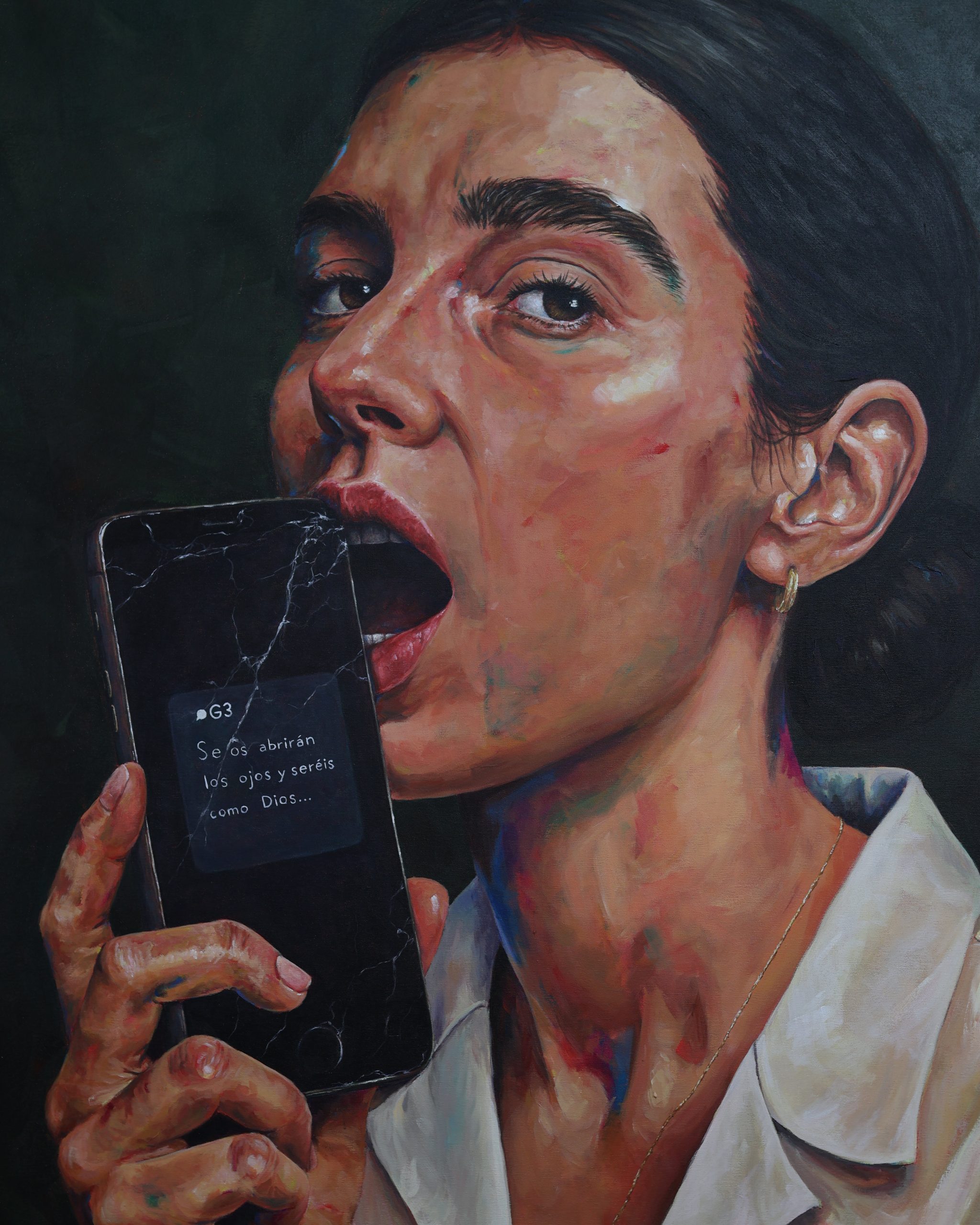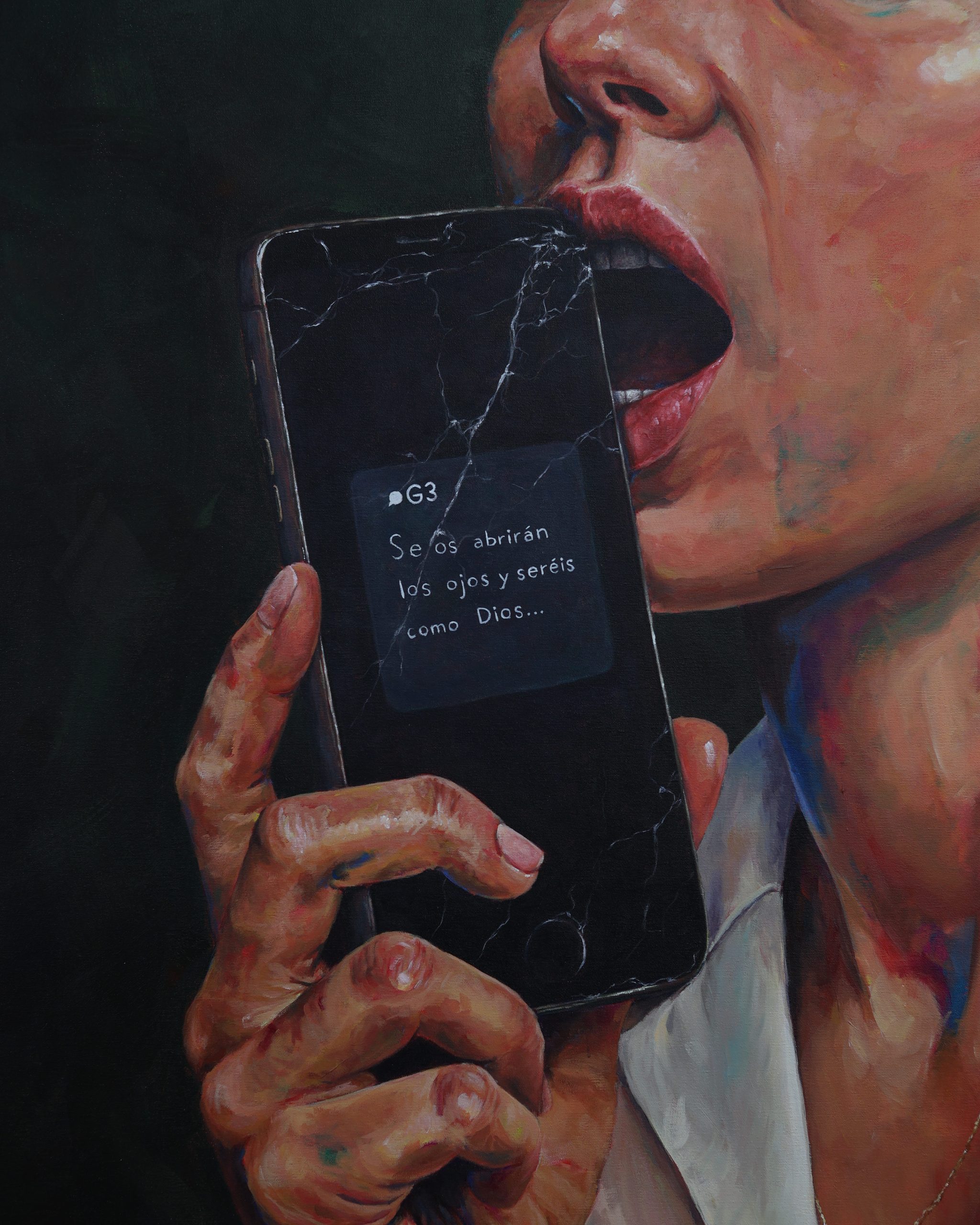 Aquí, ese fruto se convierte en un teléfono móvil: objeto deseable, atractivo y brillante, capaz de ofrecernos acceso ilimitado al conocimiento y a la conexión. Pero, como en el mito bíblico, lo que promete luz también puede traer sombra: nos esclaviza, nos invita a la comparación constante y a la validación externa, nos da la ilusión de una visibilidad que, en ocasiones, nos aparta del mundo real, del silencio, de la conexión con nosotros mismos, con nuestra gente y nuestro entorno. Esto se refleja en la obra a través de las grietas en el móvil, creando una división entre estas dos vertientes.